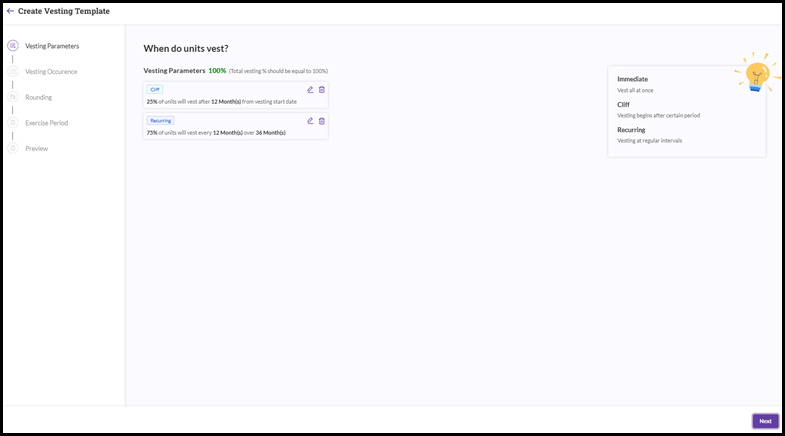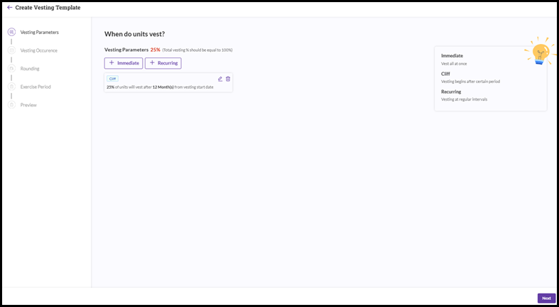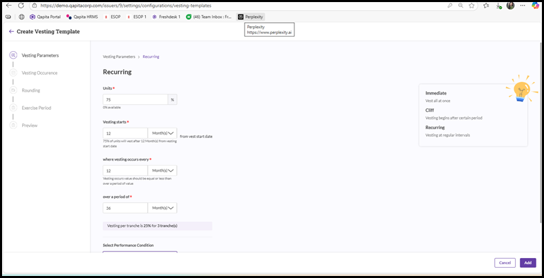 - For example, let us assume that 25 shares are set to vest initially under the Cliff method, while the remaining options are to vest at fixed intervals. In this case, you would select the ‘Recurring’ option on the screen shown above and proceed further.