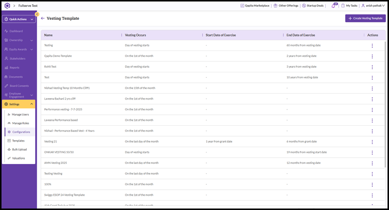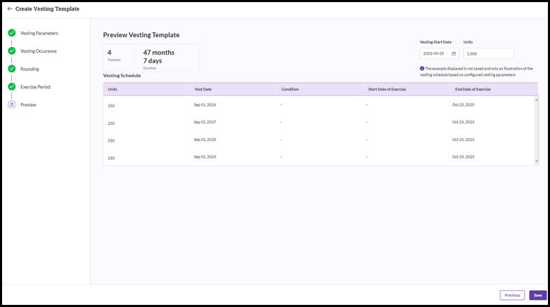 - When you select a vesting template, you'll be taken to a screen that shows a summary of all the templates that have been created so far.